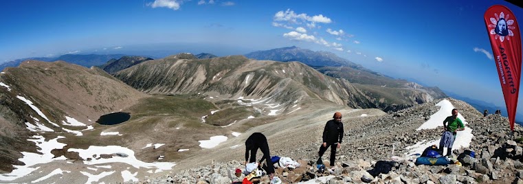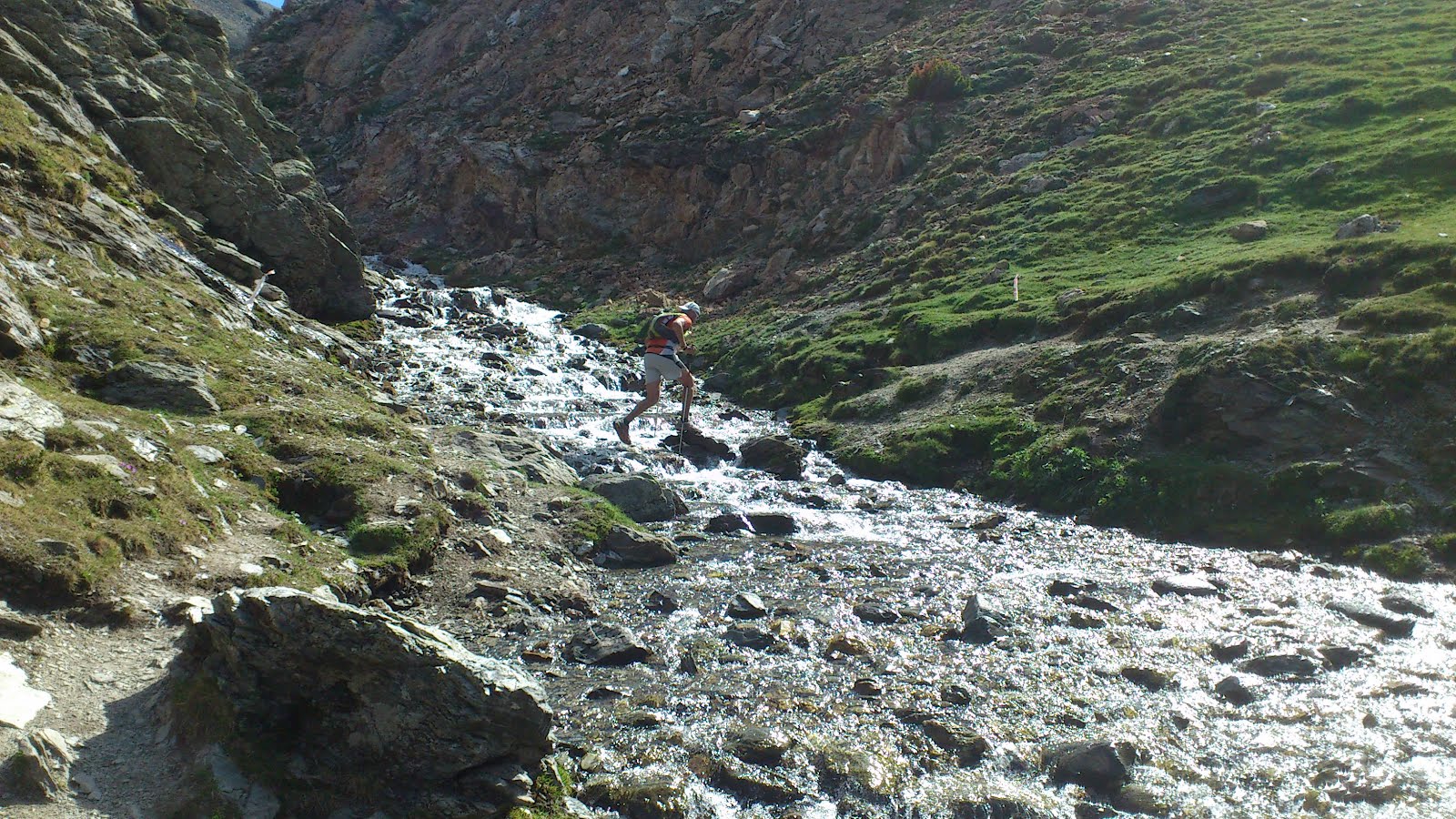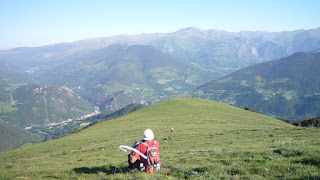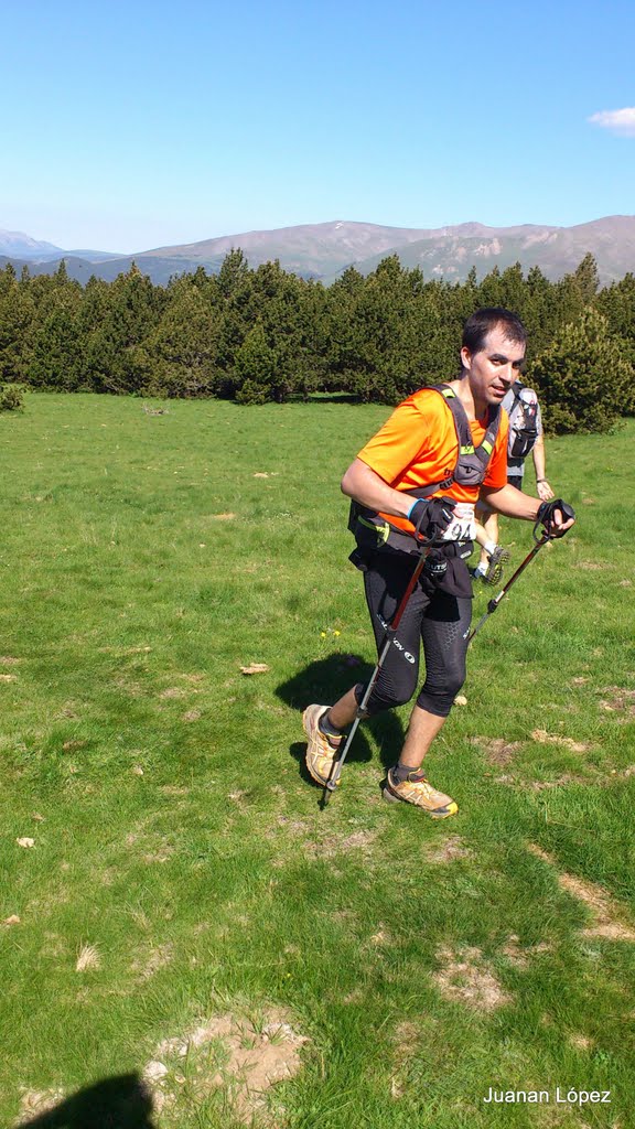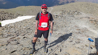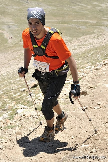 así que después de descansar aun rato al sol (no por gusto si no porque no había sombra) me despido de ramon y de nuevo subida de 5 no 10 estrellas, el puigmal 2914 m. salgo con unos minutos de ventaja pero a media subida ramon me adelanta una vez mas y a pocos minutos de distancia hacemos la cima del puigmal y aquí si que lo pase mal pero mal. consegui subir haciendo paradiñas como ronaldiño, parándome cada pocos metros porque ya estaba k.o.aqui solo estaba el chaval del control (gallego por cierto) que nos intentaba animar con eso que hacen todos los controles en todas las carreras " ya queda poco, una subidita y ya esta" ramon y yo nos lo mirabamos sin saber que decir, me hubiera gustado creerlo pero es que esa subidita era el taga 2040 m y habia que superar de nuevo unos 1000m+. con cara de entierro nos despedimos del gallego y empezamos el taga famoso, las primeras rampas suaves, las siguientes tambien asi nos fuimos animando viendo que no era para tanto hasta que empezamos a subir campo a traves por el prado y hay se acabo el sueño. desnivel de 25 a 30 % hacia que clavara los bastones como si fuera la sombrilla de la playa, cada vez mas y mas rapido para que de una vez por todas se acabara aquella subida, estabamos dandolo todo como se suele decir. y por fin la cima del taga ya solo quedaban 12 km hasta meta. la bajada como no podia ser de otra manera tambien tenia un desnivel considerable por lo que los cuadriceps echaban humo y ramon sufria con las ampollas que le acompañaban hacia ya muchos km, pero eso si sin quejarse como hace un buen guerrero.