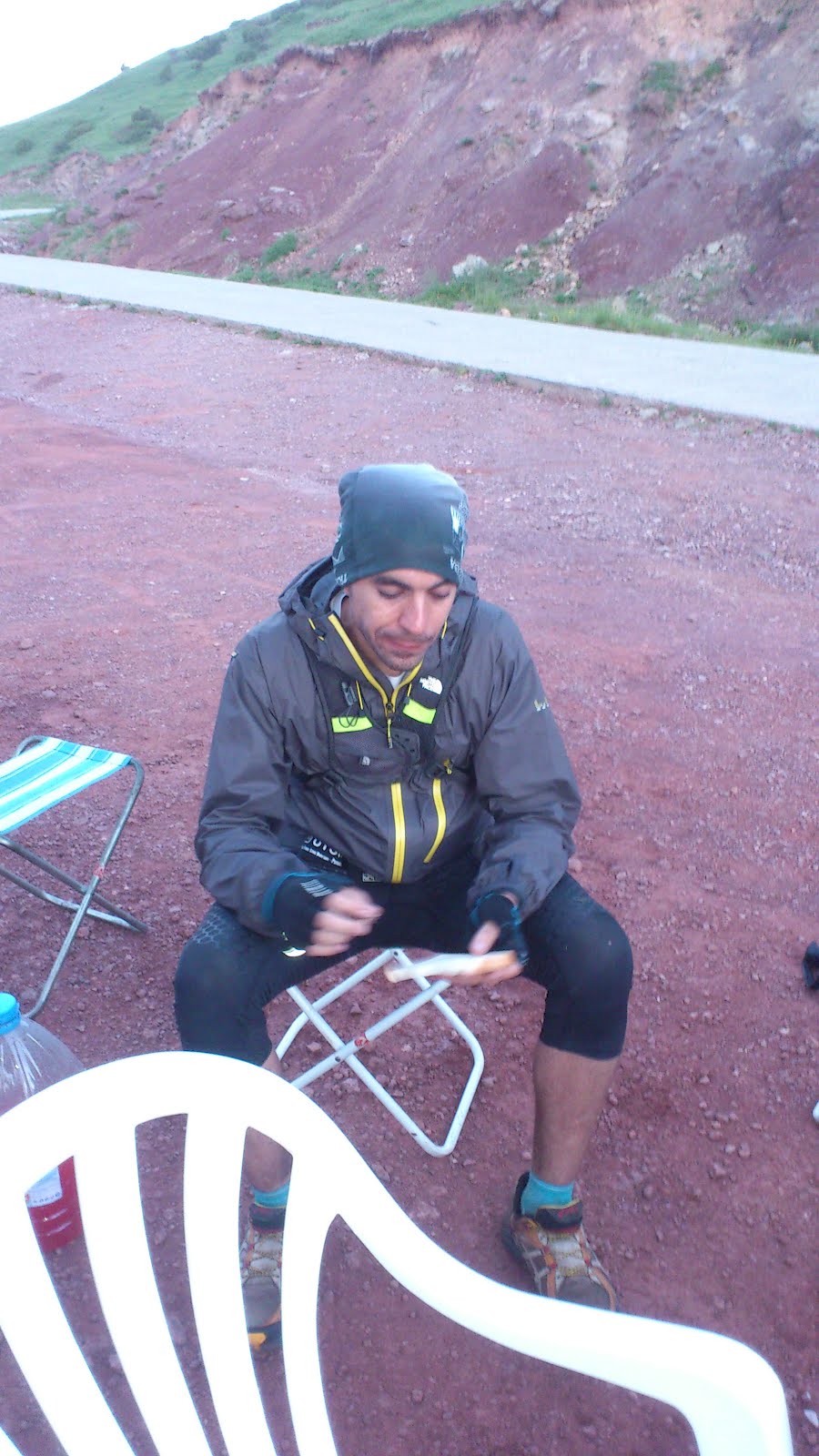 y salimos pitando hacia el siguiente control km 90.Vamos corriendo de sombra en sombra a buen ritmo bajo las ordenes del experimentado mario (o quizas deberia llamarle supermario) y nos encontramos un avituallamiento sorpresa, la familia de marc que nos ofrece agua, pastas de todo tipo y una tortilla de patatas que sabia a gloria y que nos dio alas de nuevo .GRACIAS marc. A partir del km 90 se me hizo eterno, pistas anchas, calor, mucho calor, una ampolla que pedia la hora y las tres marias en forma de subidas interminables que no paraban de sumar metros de desnivel. Pero por fin a las 18:12 llegamos al pavellon de deportes de caldes de montbui desde donde 18 horas antes habiamos salido.