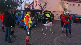 Domingo 4 marzo, antonio, jaume, jose y yo quedamos a las 6 de la mañana para ir hacia sant hilari, en poco mas de una hora ya estamos alli y nos da tiempo de tomar un cafe. Buscamos el pabellon desde donde se daba la salida y con una temperatura de 3 y 5 grados empieza la carrera. Antonio y yo salimos en el grupo de cabeza pero enseguida empezamos a perder posiciones ( logico y normal ) y nos quedamos sobre la posicion 20 o asi. Enseguida me doy cuenta que la he cagado como se suele decir al salir con la mochila y sus casi 2 kg extras, es una carrera para ir con un cinturon y un bote como mucho y yo voy lastrado fisica y mentalmente. durante las dos primeras horas no pare de maldecir la mochila y a mi mismo por el error. Antonio por su parte se descolgo sobre el km 5 y jaume y jose iban a duo preguntandose uno al otro como iban de pulsaciones y pasandoselo pipa.
